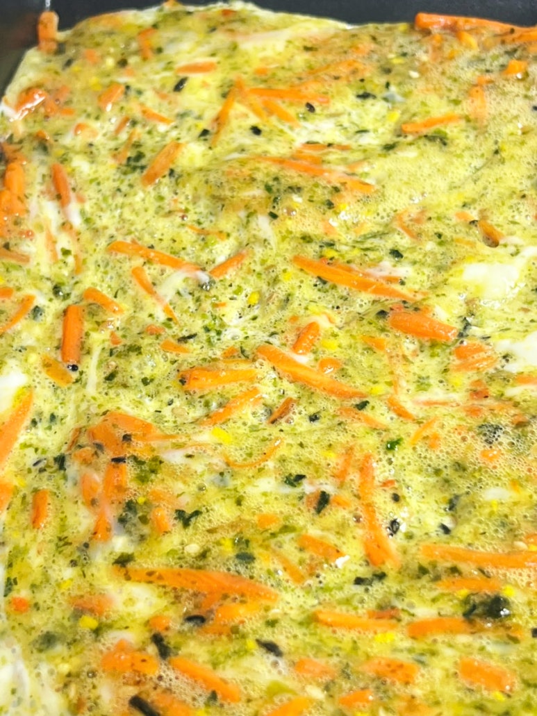 시금치, 부추, 양파, 파프리카 등 냉장고에 있는 채소 활용하기 좋지요? 비타민 A가 풍부한 채소, 계란의 지방 성분이 당근의 지용성 비타민과 어울려 영양 흡수를 높이는 찰떡궁합 재료입니다.