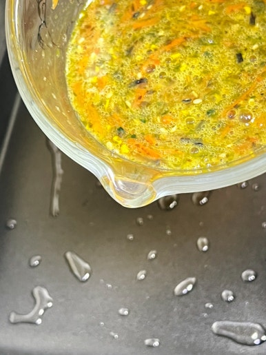 달걀에 후리카케 한 봉지를 넣고 볶은 당근을 넣어주세요. 가위를 이용해 작게 잘라 준비합니다.