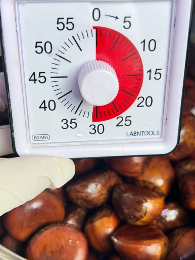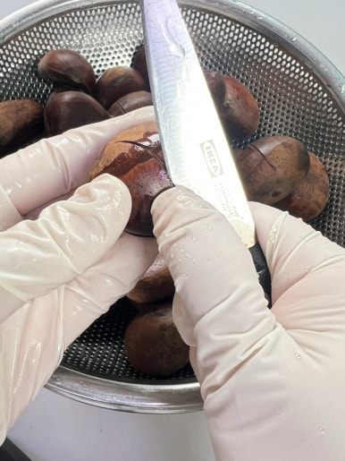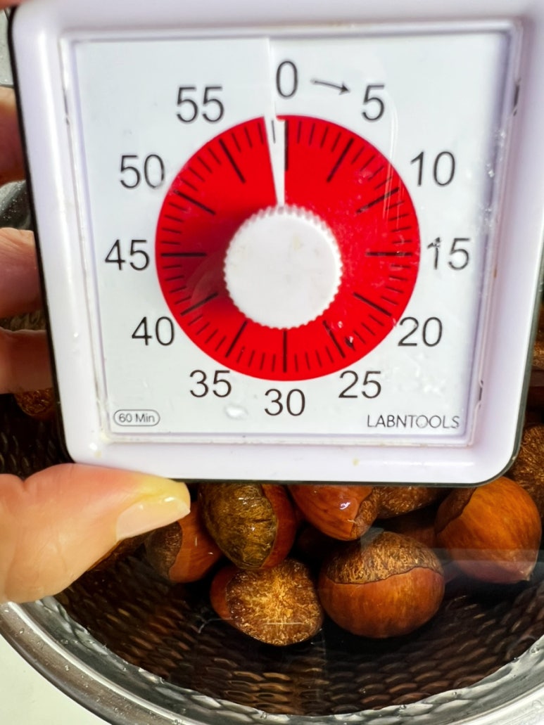 타이머를 이용해 대략 적인 시간을 맞춰 주세요. 그리고 껍질에 칼집을 내고 찜기에 올릴 준비를 합니다.
