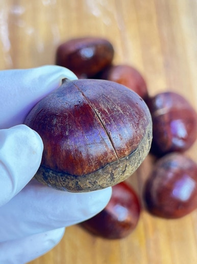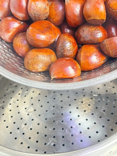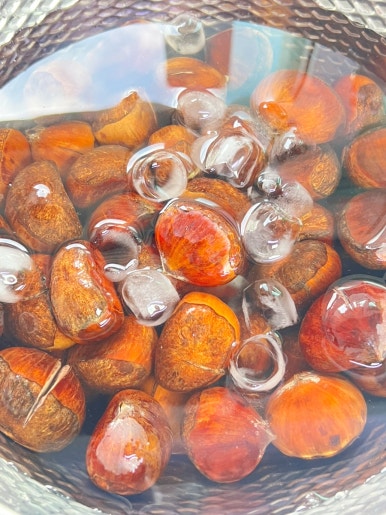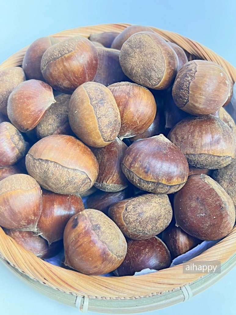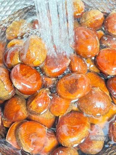 시장에서 사 온 신선한 밤(10.000원어치 )를 이용했어요. 깨끗하게 씻은 후 소금 1T를 넣고 1시간 정도 담가 주세요.