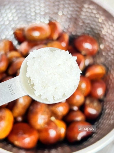 소금이 겉과 속을 분리해 주는 역할을 하게 합니다. 그래서 더 쉽고 빠르게 껍질을 제거할 수 있어요.