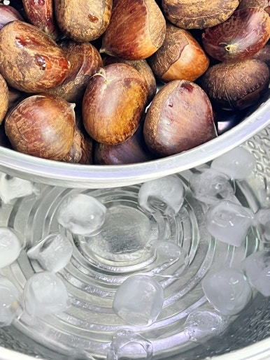 뜸 들인 후 찬물이나 얼음 물을 이용해 찬물에 넣고 식혀 줍니다. 이 과정을 통해 더욱까지 쉬운 상태가 됩니다.