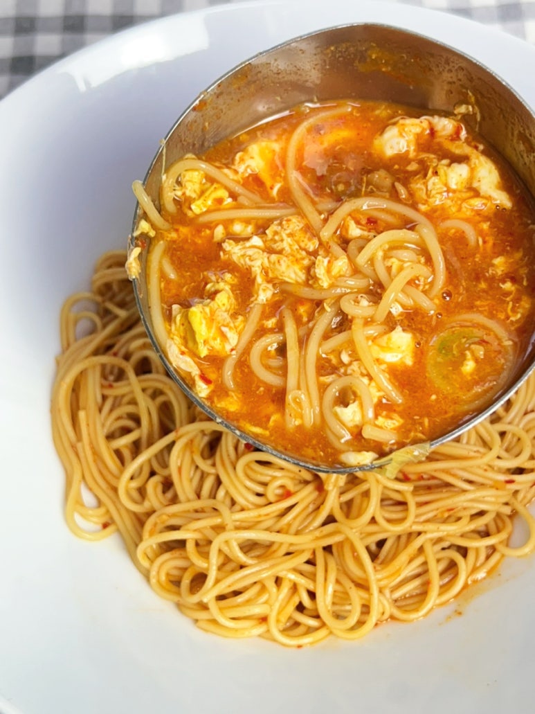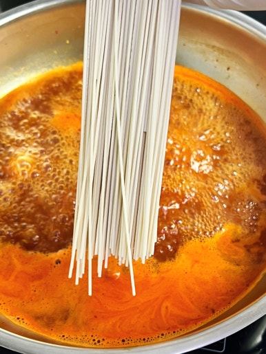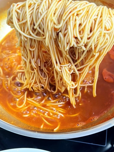 끓는 국물에 면을 넣어주세요. 삶는 과정을 생략해서 편리합니다. 걸쭉한 국물 맛과 특유의 식감이 매력적이지요. 어죽 느낌이랄까요?