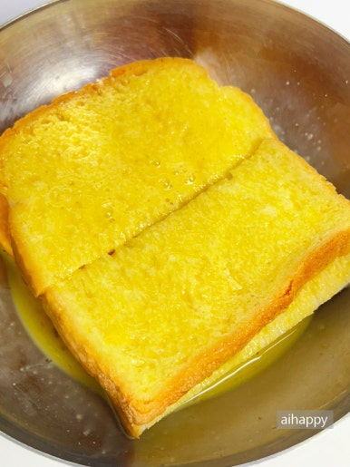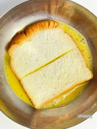 1/2로 자른 식빵을 충분히 적셔 주세요. 30초~1분 정도면 됩니다. 너무 오래 담그면 빵이 흐트러질 수 있으니 주의해 주시고요.