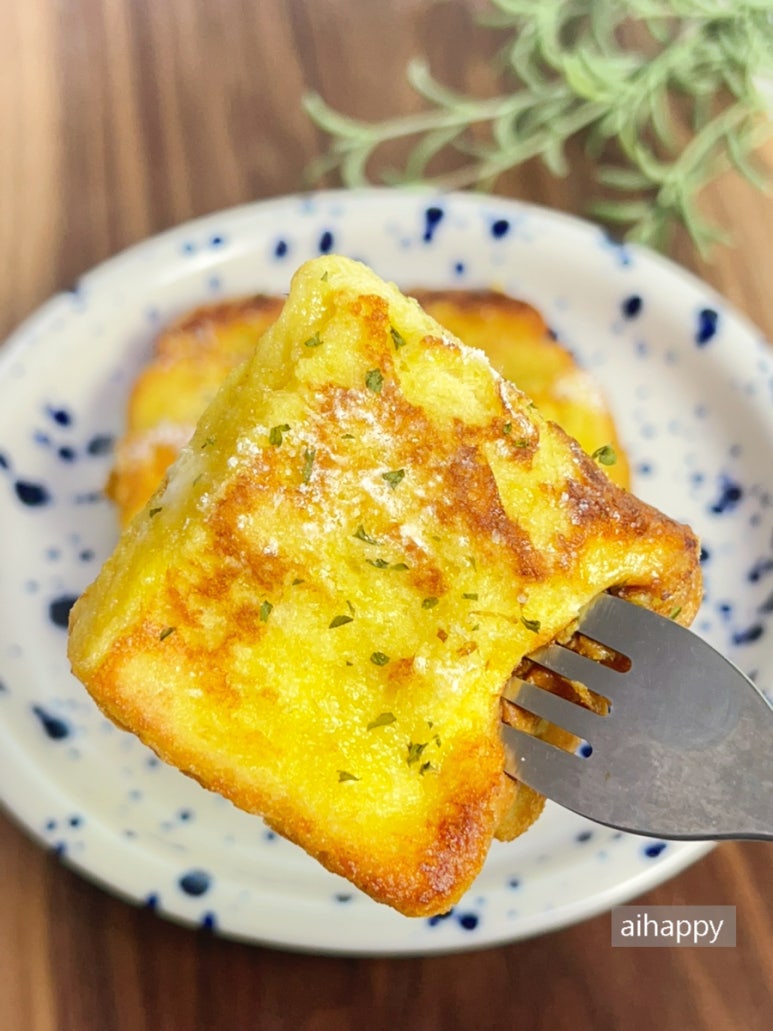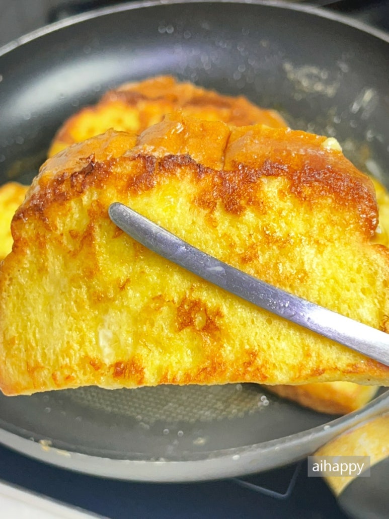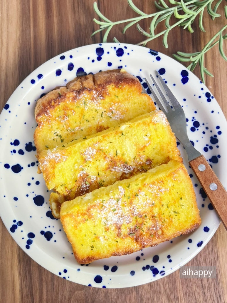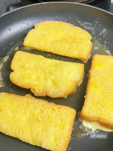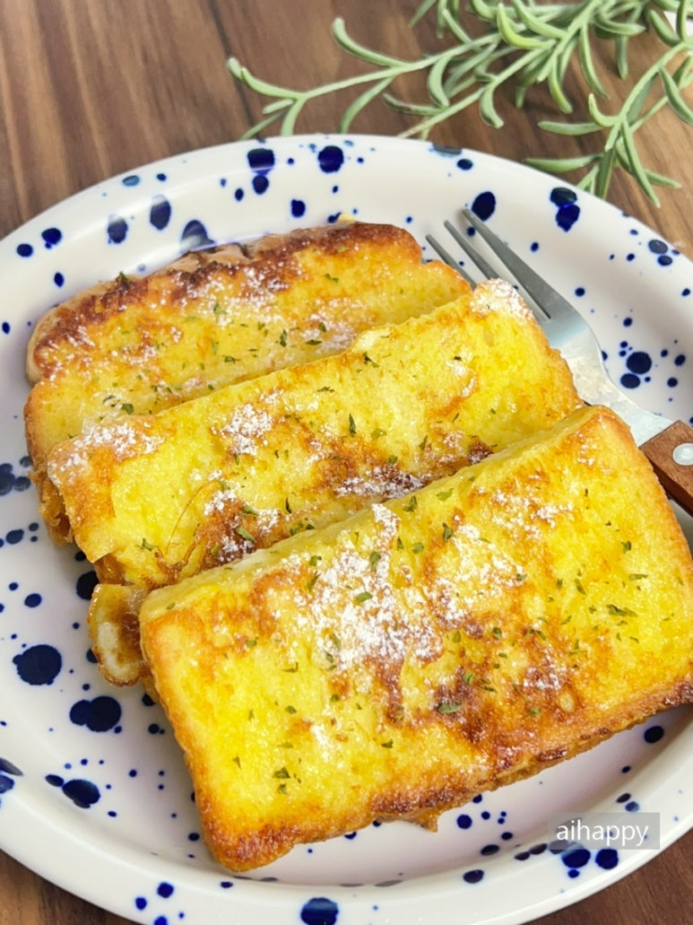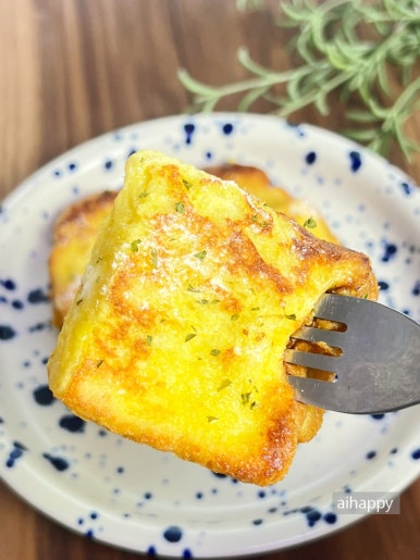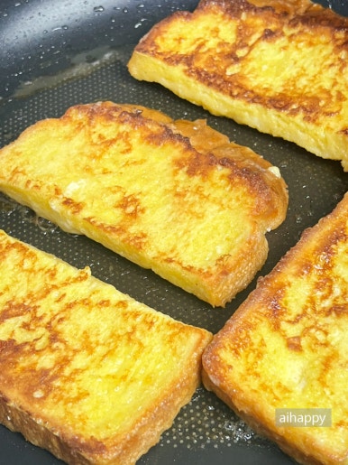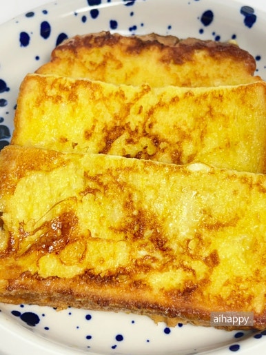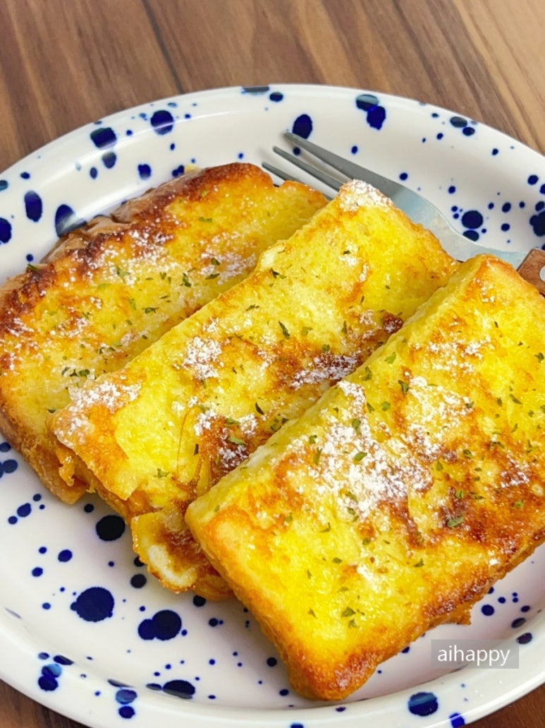 커피, 유유, 과일 등을 곁들이면 브런치 메뉴로 활용해도 좋아요. 혼자 먹기 아까운 황금 빛깔 토스트입니다.