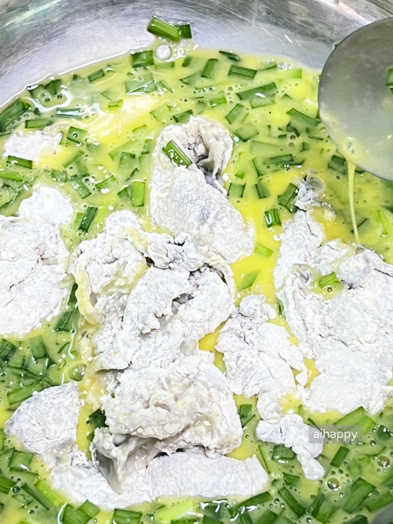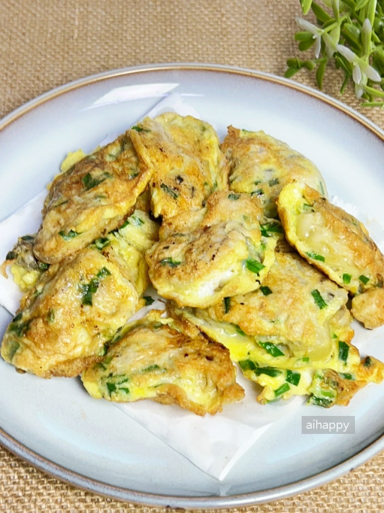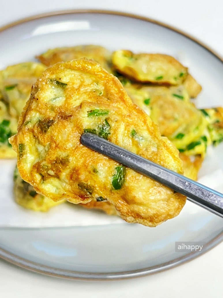 부추도 한 줌 추가했어요. 색감과 식감을 위해 넣으면 밋밋 했던 부침 요리를 먹음직스럽게 만들 수 있습니다.