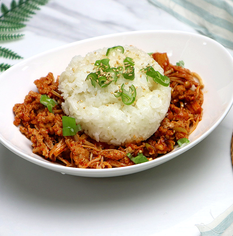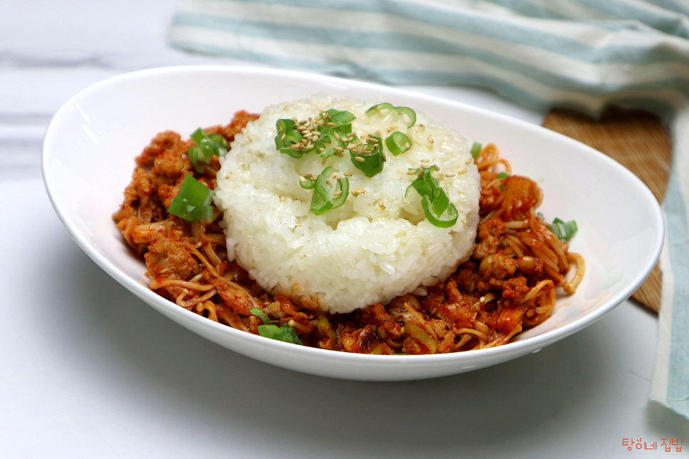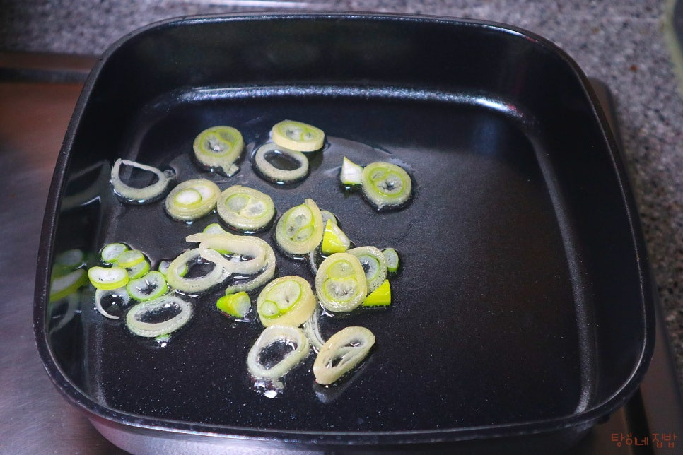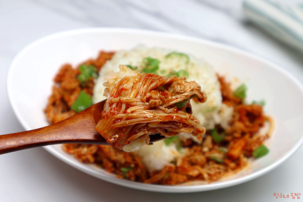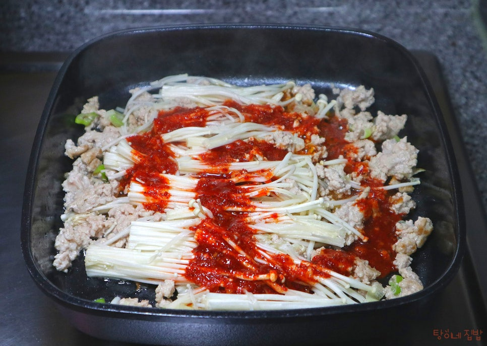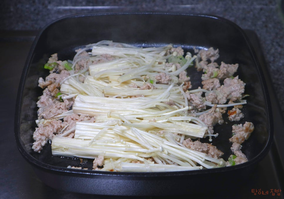 팽이버섯 1봉지(150g) 돼지고기 다짐 육 150g 대파 흰 부분( 파기름용)10cm 1개 대파 초록 부분 (고명용) 5cm1개