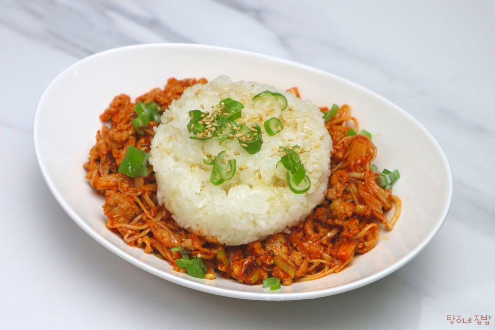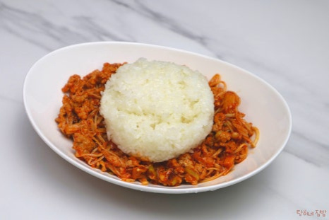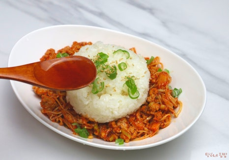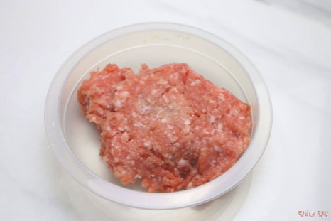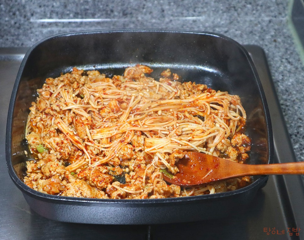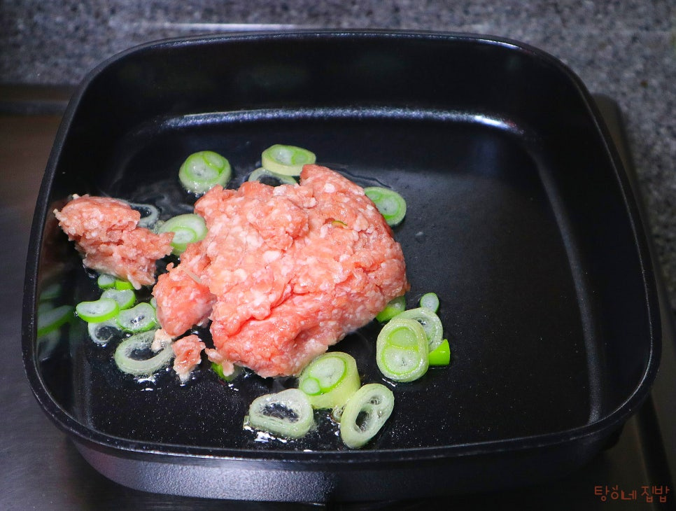 다짐육은 익는 과정에서 덩어리지기 쉽기 때문에 스푼으로 고기를 으깨가며 골고루 볶아주는 게 포인트!