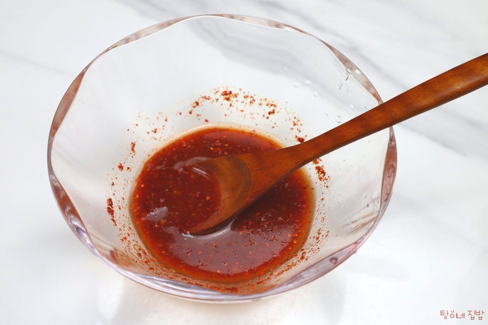 고추장 0.5T 다진 마늘 0.5T 설탕 0.5T 올리고 당 0.5T 고춧가루 2T 맛술 2T 양조간장 1T 물 3T 후추 소량