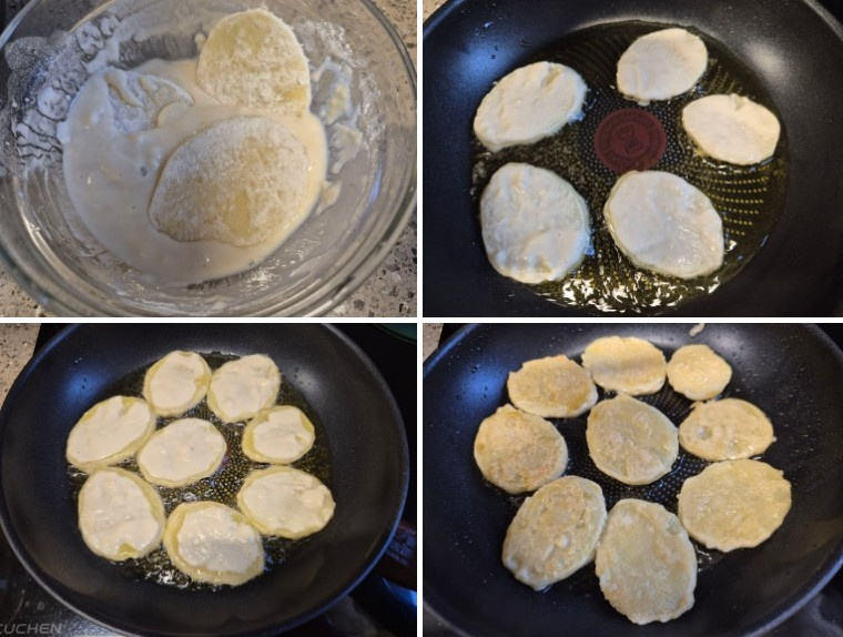 반죽 물에 튀김가루를 묻혀놓은 감자를 넣고 반죽물을 입혀주세요 이어서 달군 팬에 기름을 넉넉히 넣고 반죽 물 입힌 감자를 구워주세요 앞뒤로 뒤집으면서 노릇하게 구워주세요