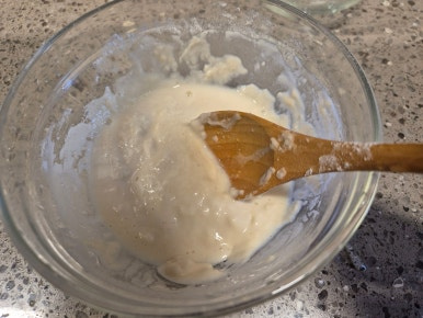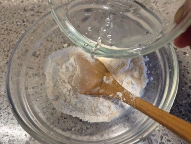 튀김가루에 물을 넣고 걸쭉하게 반죽물을 만들어요