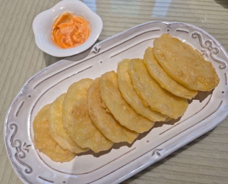 스리라차 소스에 마요네즈를 넣고 섞어서 소스도 준비하고 앞뒤로 바삭하게 구워진 감자를 담아주세요 겉은 바사삭하고 속은 파삭파삭이고고 그냥 먹어도 소스에 찍어서 먹어도 맛있어요