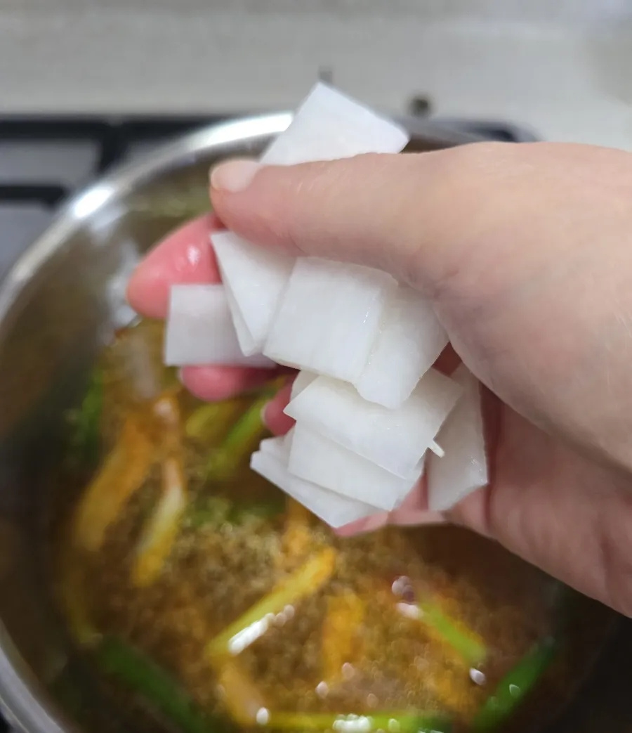 끓기 시작하면 무를 넣고 바글바글 5분!