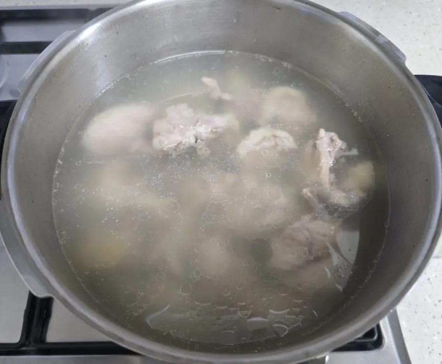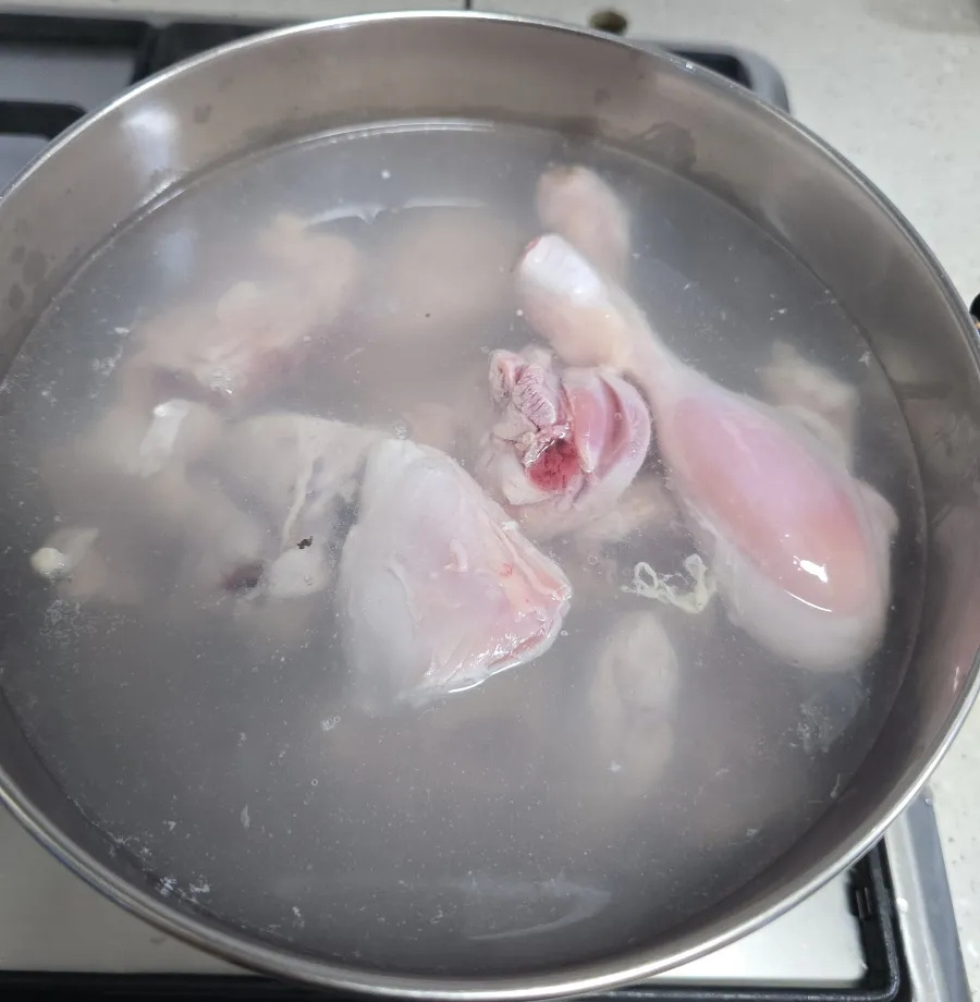 냄비에 물을 끓여주고 닭을 넣고 데친 다음 흐르는 물에 불순물을 제거 해주세요.