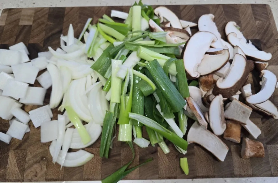 무는 나박 썰기, 대파는 굵게 채썰고, 양파와 버섯도 적당한 크기로 썰어 놓아요.