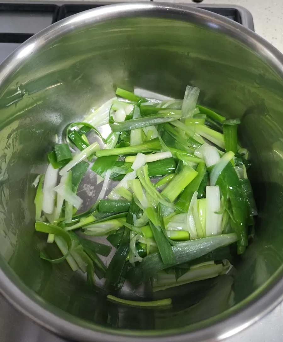냄비에 들기름 2 숟가락 두르고 썰어 놓은 대파를 넣고 파가 흐물해질 때까지 볶아요.