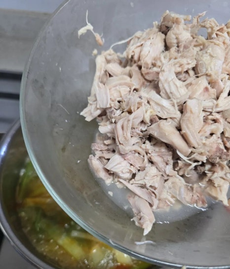 찢은 닭고기와 양념장을 육수에 풀어줍니다.