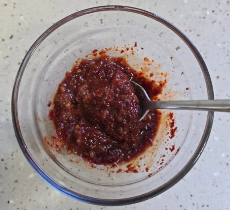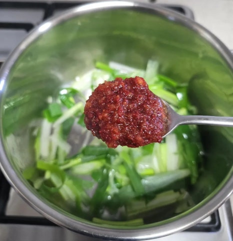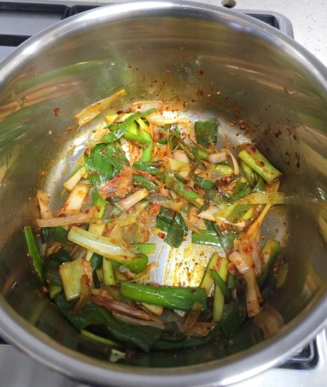 대파 기름이 만들어 지면 만든 양념장 한 숟가락을 넣고 불을 약하게 줄인 다음 30 ~ 60초만 볶아 고추기름을 만들어 줍니다.