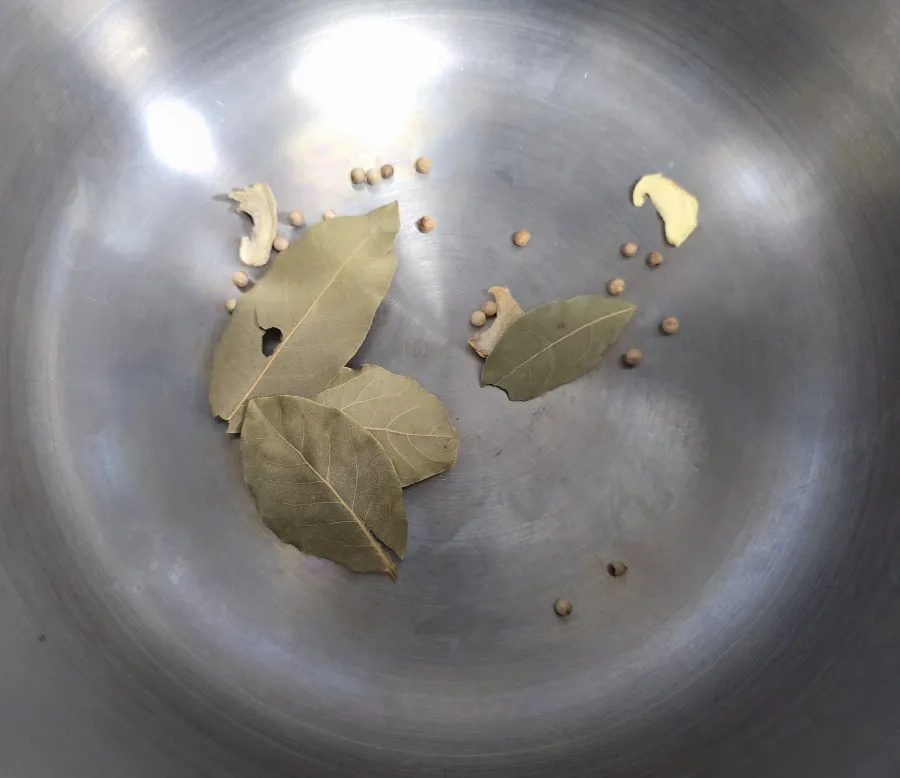 압력솥에 잡내 제거에 필요한 월계수잎, 통후추, 말린 생강 등을 넣어주세요.