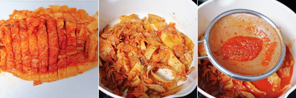 김치는 쫑쫑 썰어서 냄비에 넣고 김치 국물 3/4컵은 체에 걸러 넣어줍니다