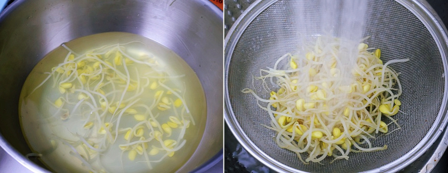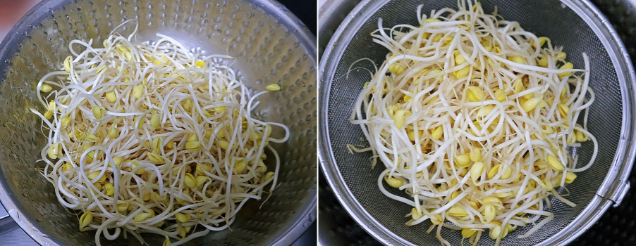 콩나물 건져놓은 것은 찬물에 헹구어 체에 밭쳐 물기를 빼줍니다