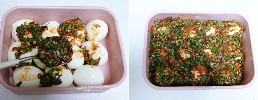계란 위에 부추 양념장을 뿌려주면 계란장 완성입니다