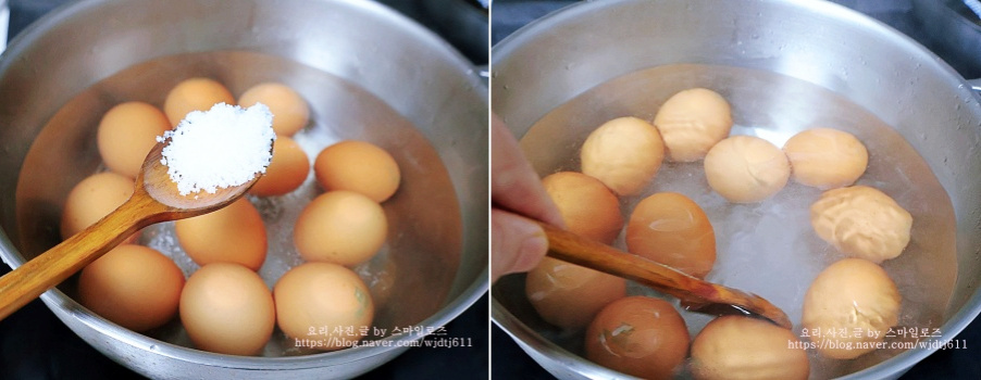 냄비에 한번 씻은 계란을 넣고 소금 0.5스푼을 넣고 물이 끓기 시작하면