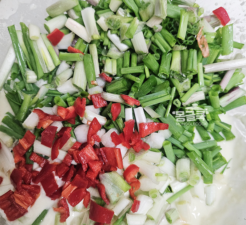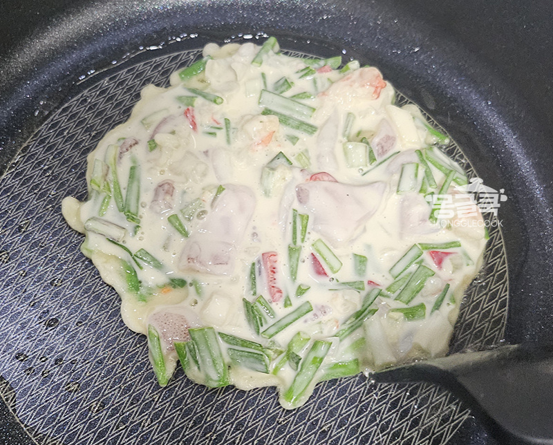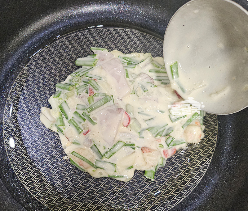 반죽은 너무 묽지 않게, 약간 되직한 정도로 맞추는 게 포인트예요.
