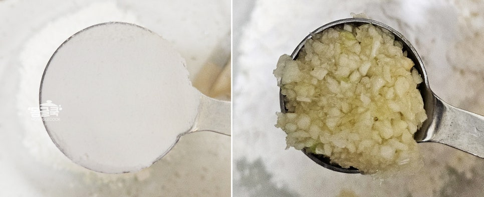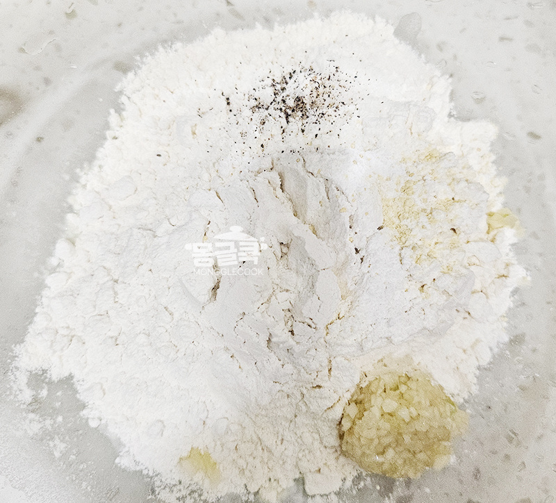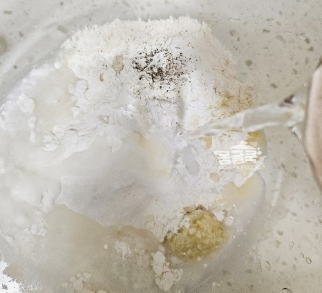 볼에 부침가루 1컵, 찹쌀가루 2큰술, 다진 마늘 1작은술,