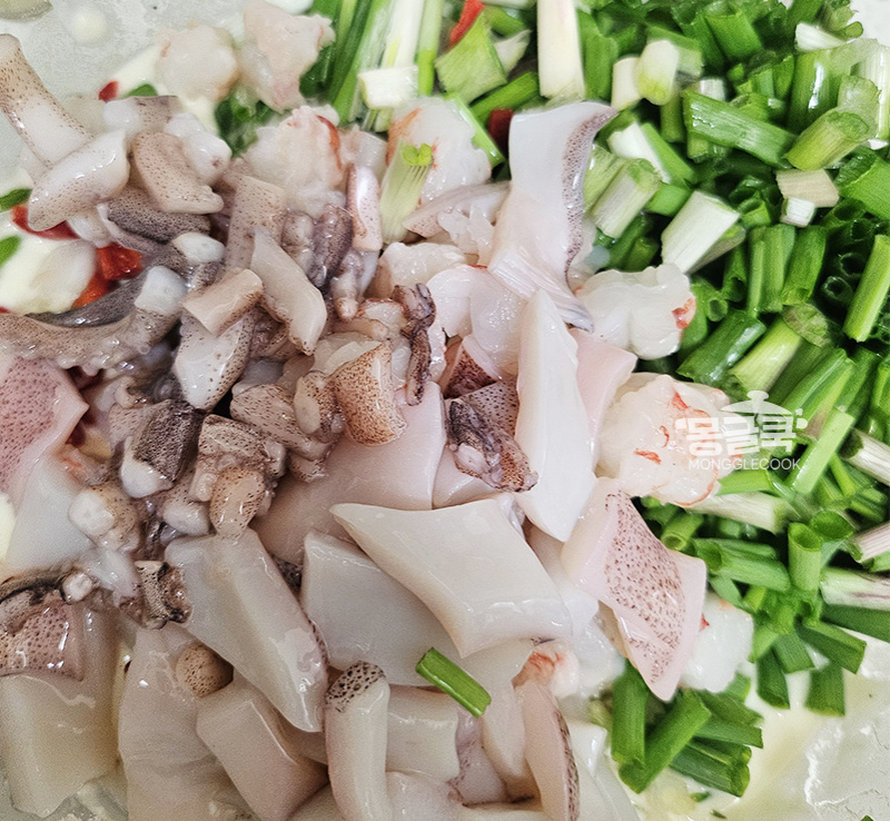 오징어는 손질 후 적당한 크기로 썰고, 새우도 먹기 좋게 잘라주세요.