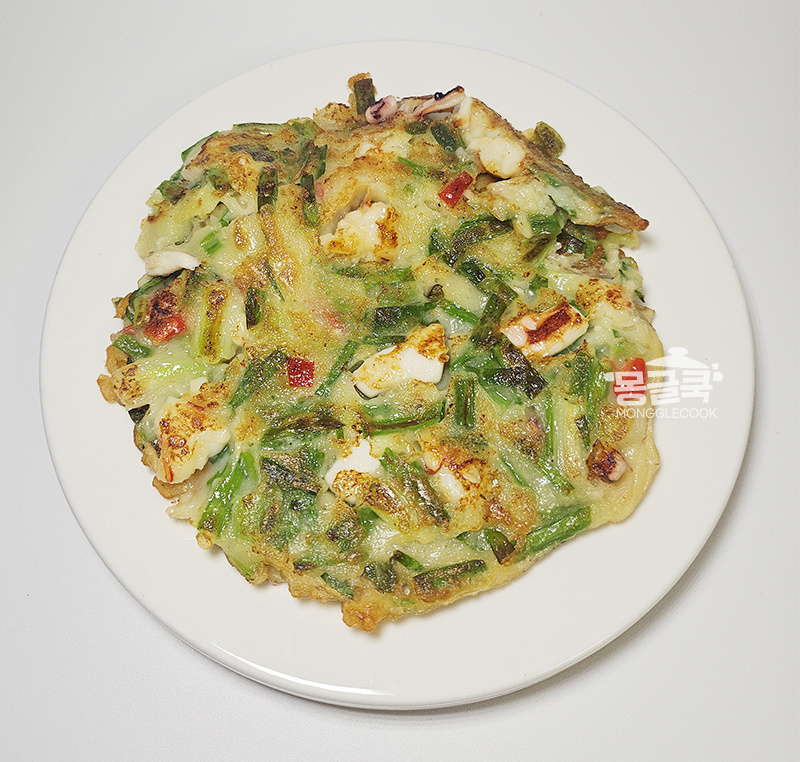 쪽파를 쫑쫑 썰어 넣어 아이들도 잘 먹는 해물파전 스타일 오징어파전