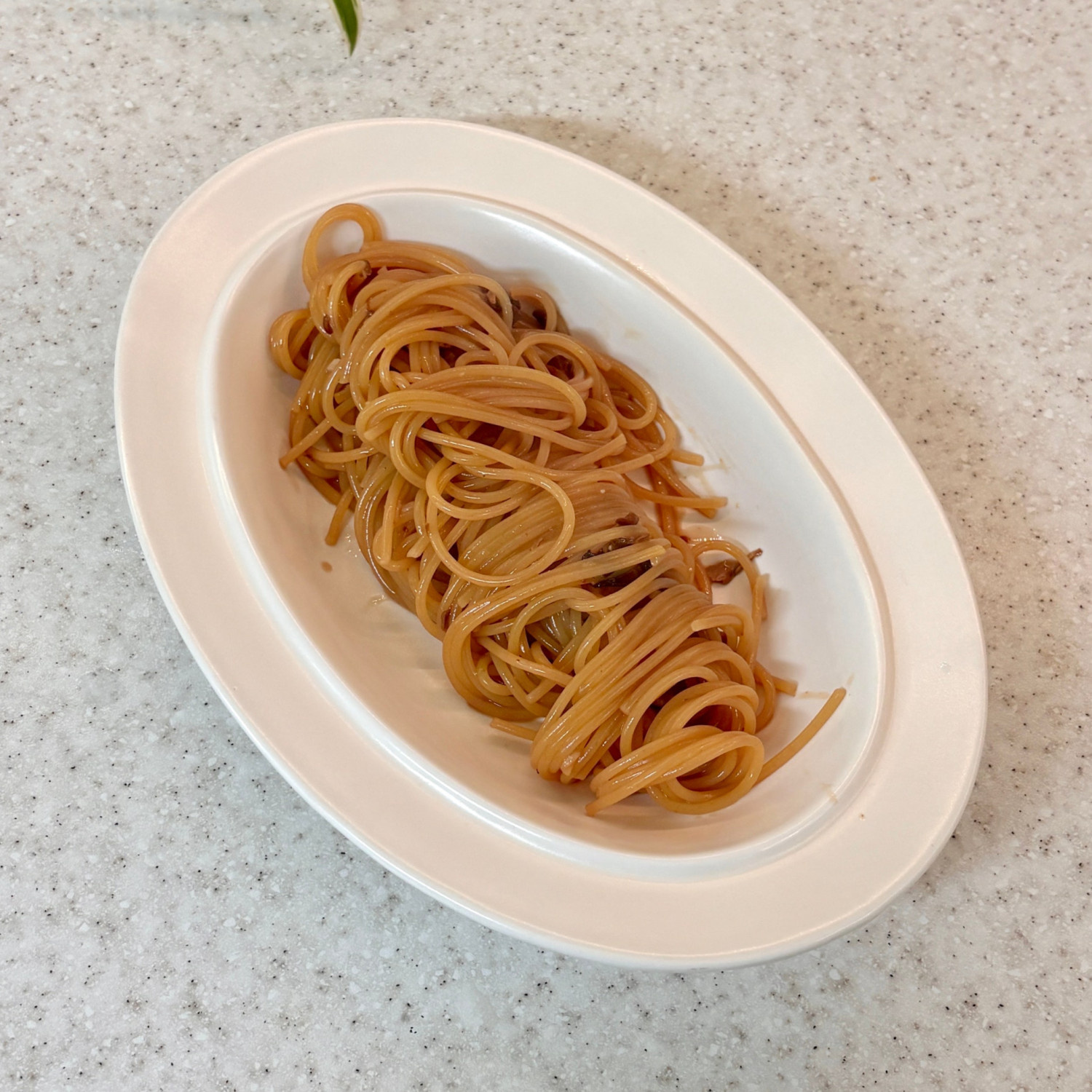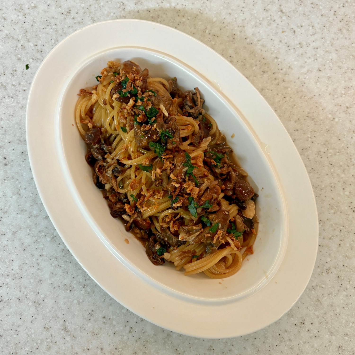 굴 조림 , 스파게티 면 80~100 g , 올리브오일 30 ml , 다진 마늘 10 g , 페페론치노 2 개 , 양파 플레이크 , 파슬리 , 소