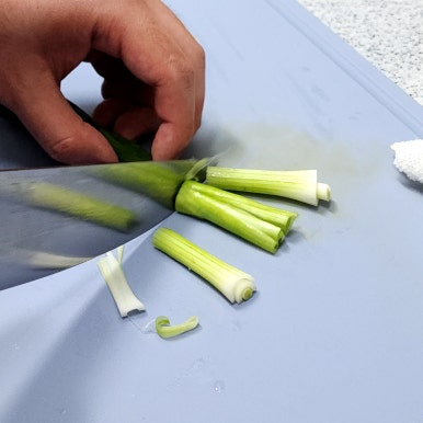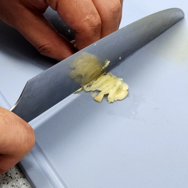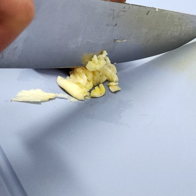 또한 물을 한 두 방울 떨어뜨려 보세요. 마늘이 칼에 들러붙지 않습니다.