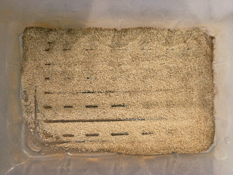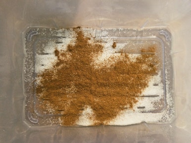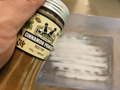 플라스틱 찬통에 설탕 2숟가락, 계피가루 1숟가락(취향에 따라 추가해도 됨)을 넣고 흔들어서 잘 섞어서 준비해준다