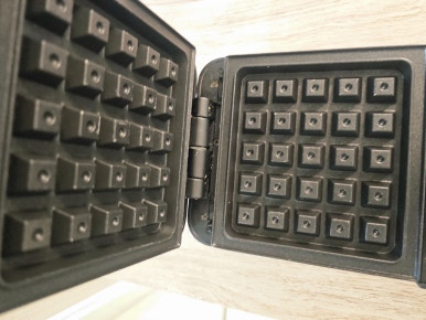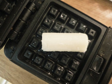 손가락 길이만큼 잘라준후 기름을 두른 와플기에 가래떡을 넣고 3분가량 구워준다