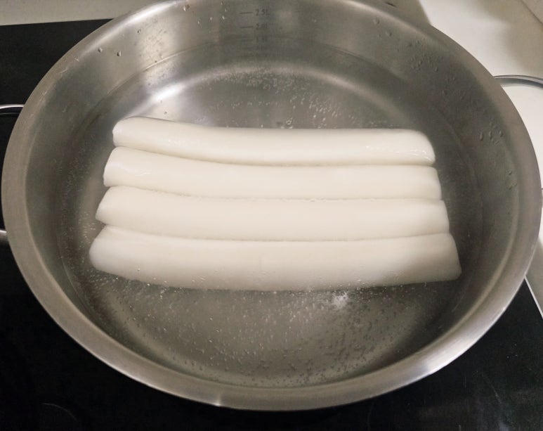 끓는물에 냉동 가래떡을 넣고 10분정도 삶아준 후 찬물로 한번 헹궈서 열기를 시켜준다