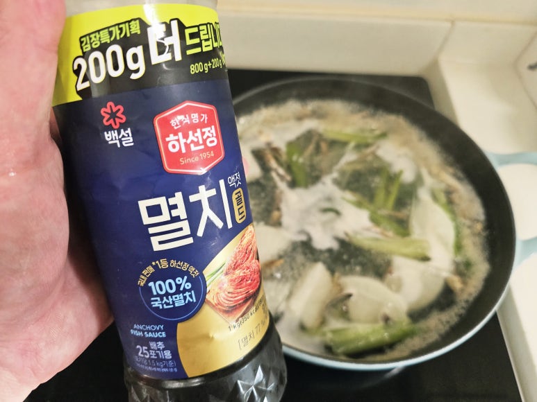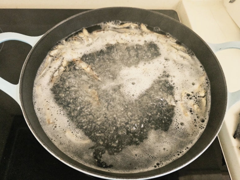 멸치육수가 우려지면 불을 끄고 다시마 2~3장을 넣고 10분가량 추가로 육수의 감칠맛을 내어준다