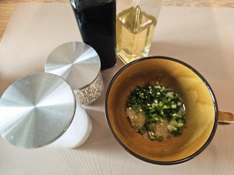 간장 2숟가락, 간마늘 1숟가락, 땡초 1개, 식초 1숟가락 깨소금 1숟가락, 물 4숟가락을 넣고 잘 섞어서 양념장을 준비해준다