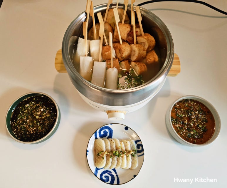멸치, 다시마, 대파, 무를 건져내어주고 우려낸 육수에 멸치액젓 1숟가락, 국간장 1숟가락을 넣고 육수를 끓여주고 준비해준 어묵꼬치, 떡꼬치, 곤약꼬치를 넣어서 끓여준다