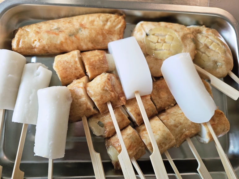 가래떡도 끼워주고 쫀득한 곤약이 있어서 곤약도 끼워주고 어묵도 한입크기로 잘라서 끼워준다