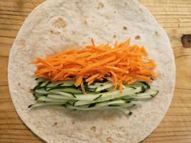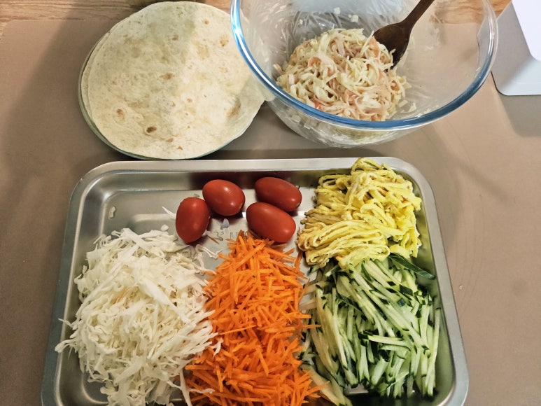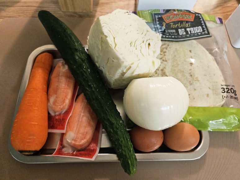 또띠아, 크래미, 오이, 당근, 양파, 양배추, 계란을 준비해준다