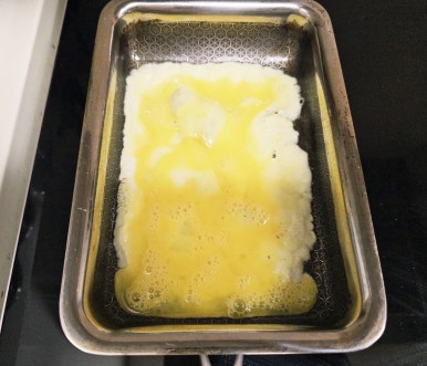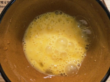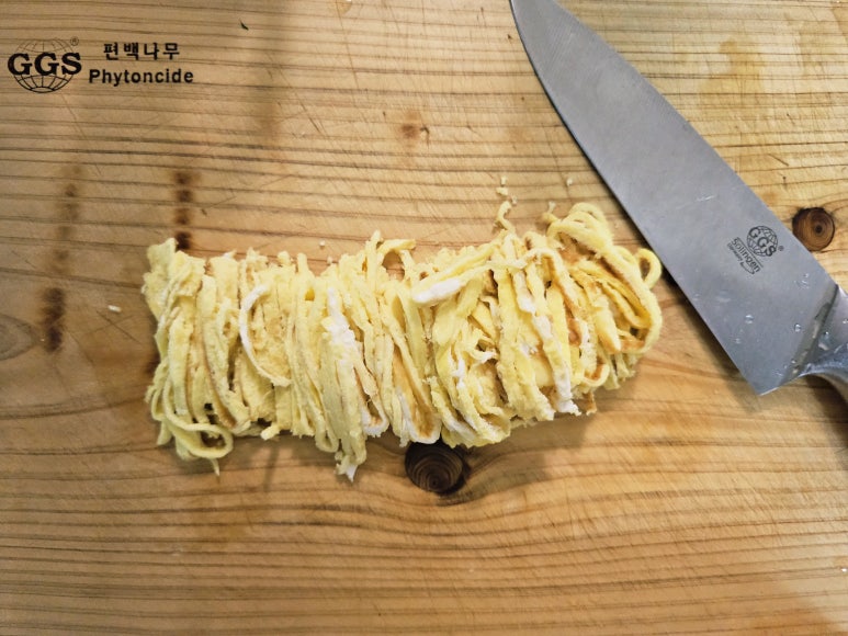 계란2개로 만든 계란물로 계란지단을 만들어준 후 채썰어서 준비해준다