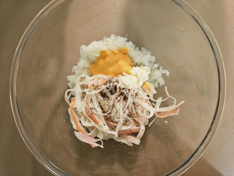 믹싱볼에 크래미와 양파를 모두 넣고 마요네즈 1숟가락, 허니머스터드(살짝 매콤한게 좋으면 스리라차 소스 1/2숟가락), 후추 살짝 뿌려준 후 골고루 잘 섞어서 잠시 모셔둔다