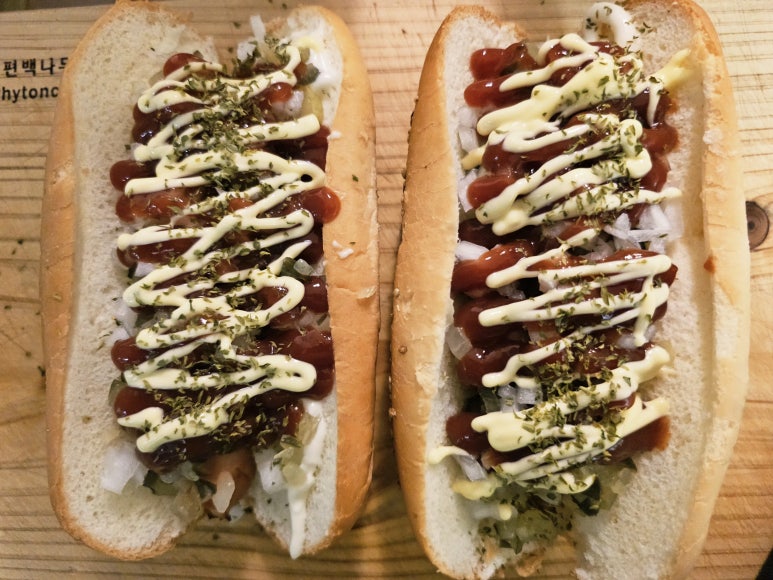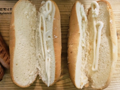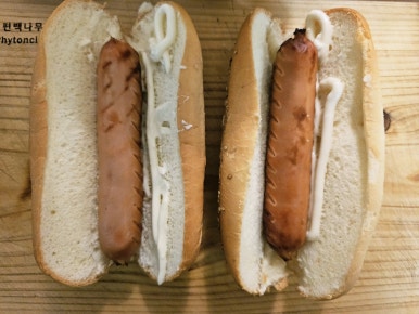 빵 한면에 마요네즈를 뿌려지고 뜨끈한 소시지를 성의없이 툭~ 던져서 끼워준다 ㅋㅋ