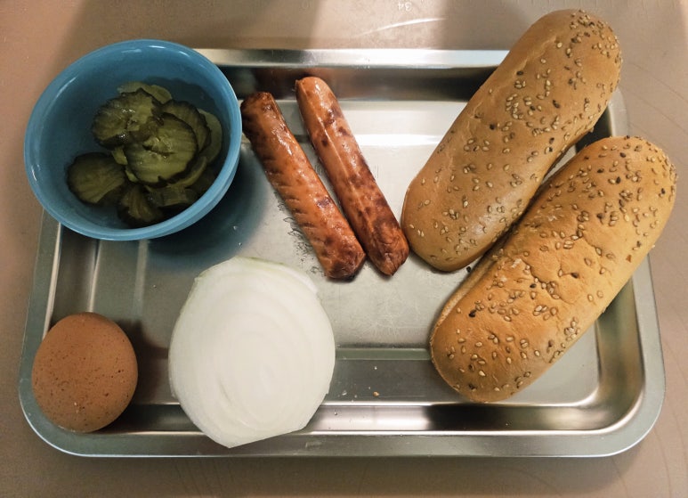 냉동실에 있는 핫도그빵 2개, 소시시 2개, 피클 한 움큼, 양파 1/3개를 준비해준다
