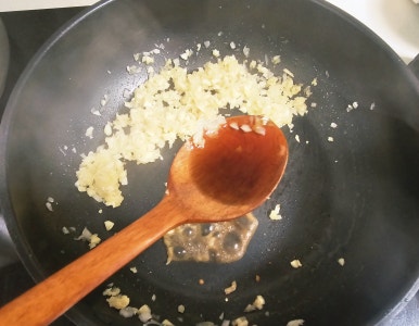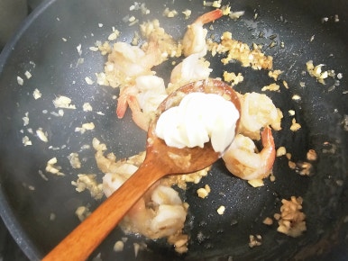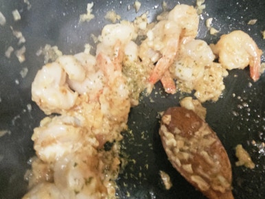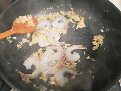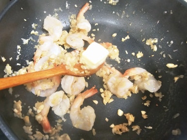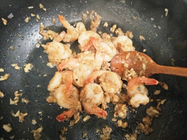 양파와 마늘이 노릇노릇해졌으면 멸치액젓 1숟가락을 프라이팬 바닥에 살짝 태워준다 생각하고 끓여주다가 손질해 놓은 새우를 넣고 새우가 익도록 볶아준다