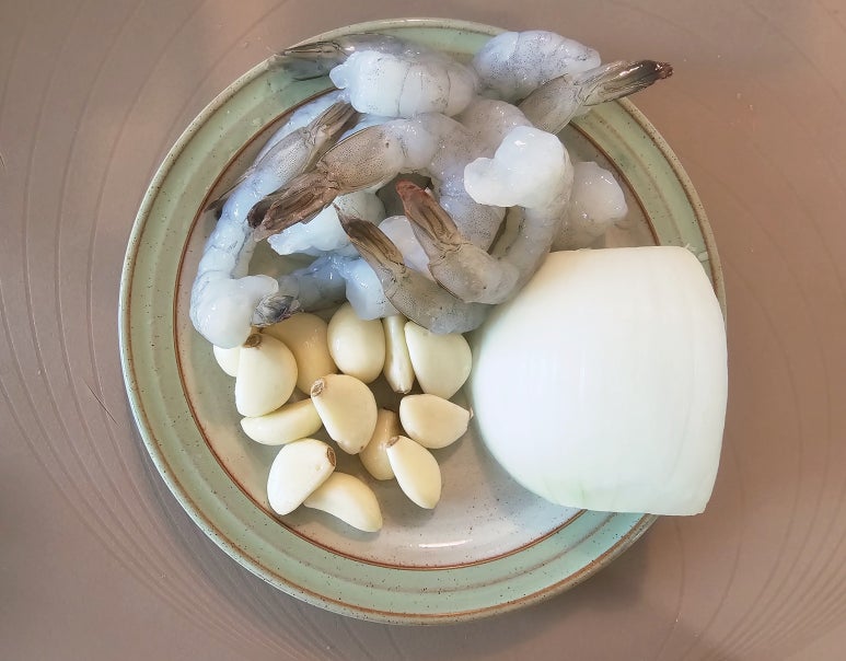 냉동실에 있는 칵테일 새우(15~18마리)를 자연해동시켜주고 통마늘 한움큼(15알정도)와 양파 1/2개를 준비해준다