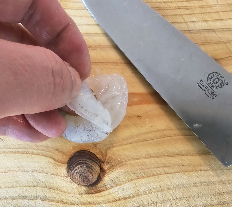 칵테일 새우는 등살 부분을 칼로 1/3정도 잘라서 양념이 속까지 잘 스며들 수 있도록 칼집을 내어준다