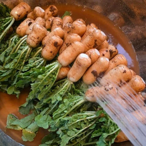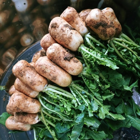 무와 잎에 묻은 흙이