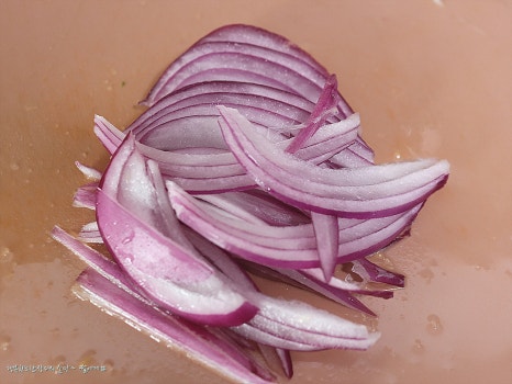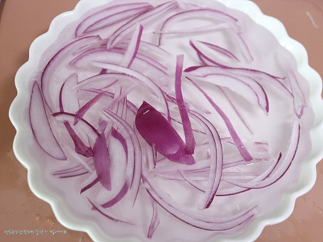 적양파는 얇게 채썰어 물에 헹구어 놓고~